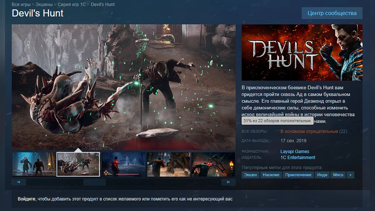 Вчера вечером на ПК вышел новый приключенческий экшен под названием Devil's Hunt от студии Layopi Games и издательства 1C Entertainment. В Steam игра получила всего 31% положительных отзывов (на момент написания новости).