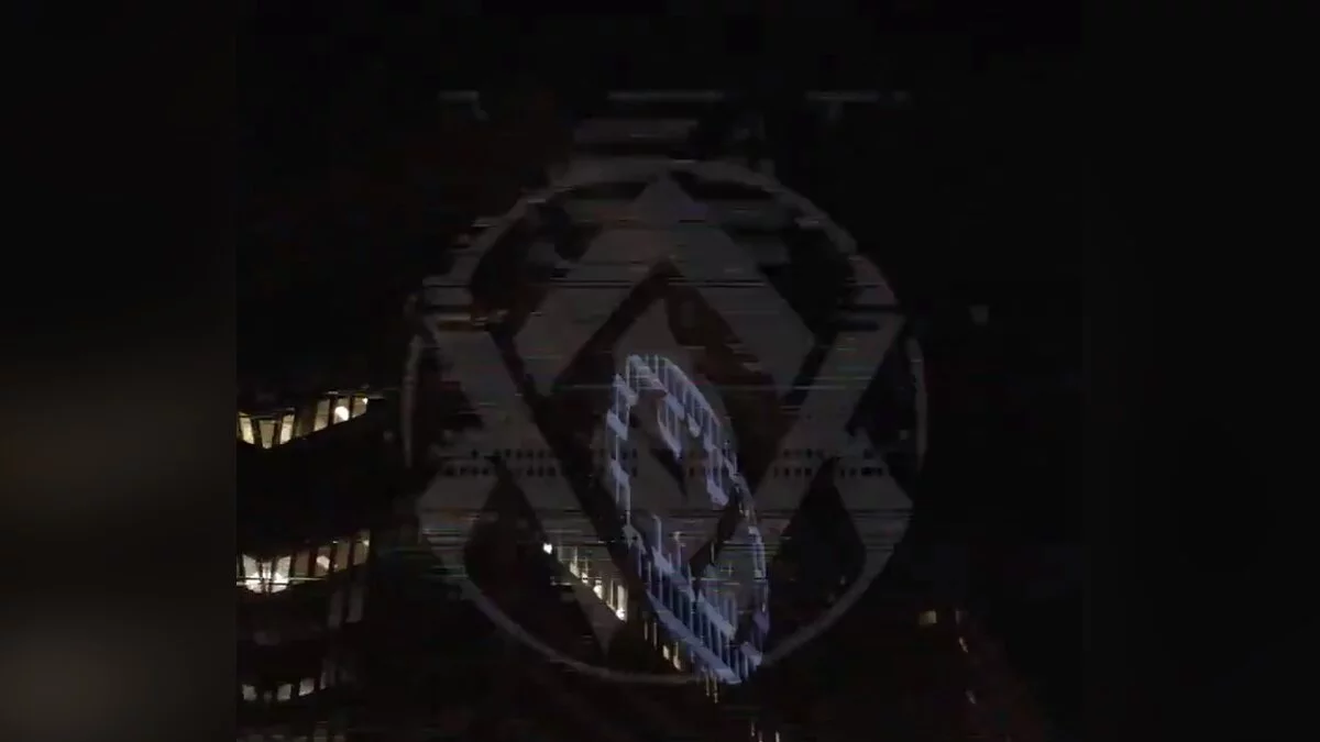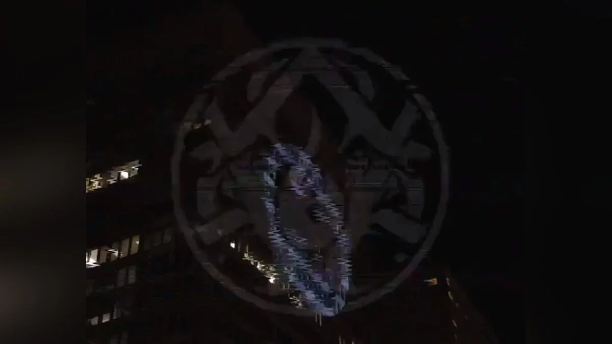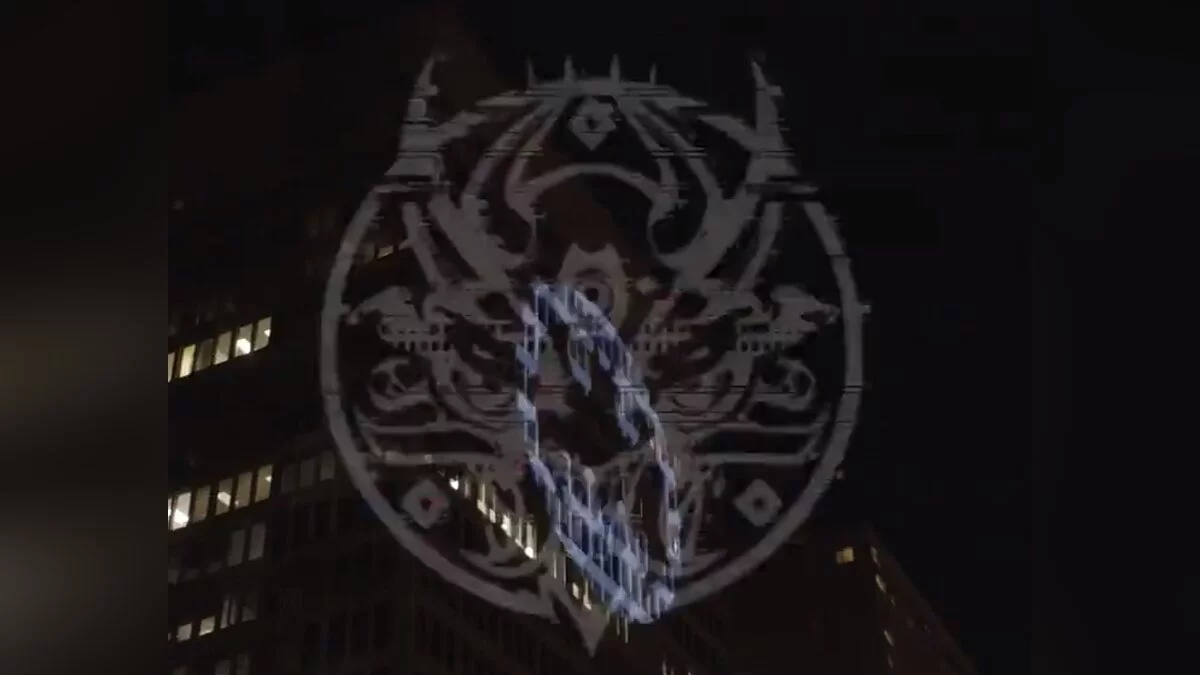 Прожектор высвечивает логотип Бэтмена, но на долю секунды в ролике появляются странные символы.