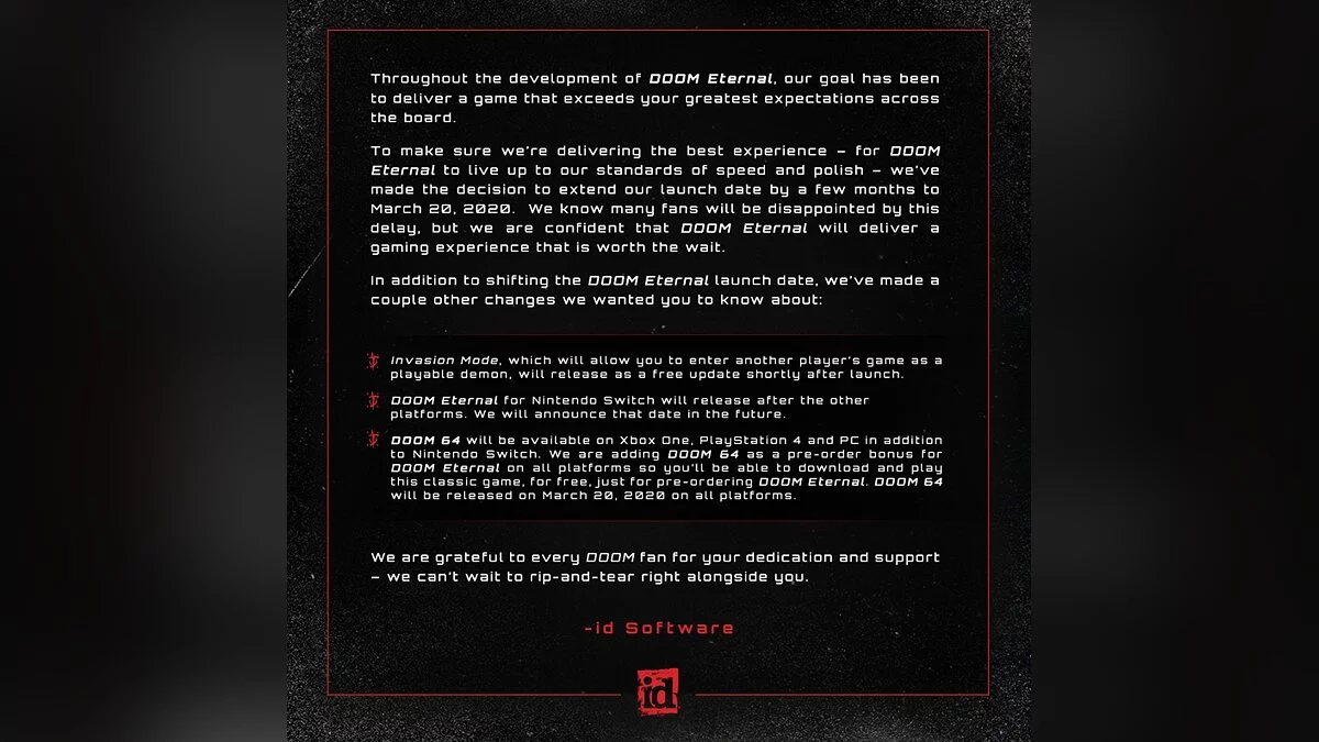 id Software объявила о переносе релиза Doom Eternal на 2020 год. Как заявили разработчики, время необходимо для дополнительной полировки игры.