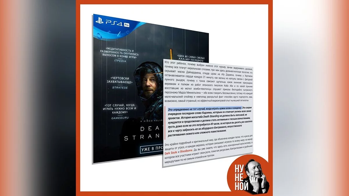 Моя ревью-цитата впервые попала на рекламу видеоигры, да ещё какой. Правда, есть важный нюанс: в рецензии на Death Stranding я подразумевал кардинальной иной вывод, это не просто не тот случай, когда играть нужно не всем и каждому, а ещё и с дополнительным окрасом в роли «определённо» как значимого слова. Но в цитату взяли отрывок поменьше, а ещё и убрали частицу «не», чтобы не разубедить. По правде скажу: я без претензии, кроме одной — для избыточного пафоса и звонкого словца, я в рецензии написал словосочетание «это самая громкая видеоигра, о которой хочется молчать», — чем не топовая фраза, забирающая лавры всего игрожура вообще?