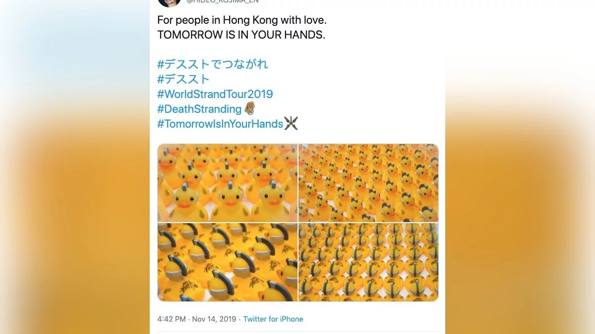 Кодзима приготовил 80 уточек в виде Люденса, символа Kojima Productions, которые получат некоторые счастливчики, купившие Death Stranding. Твит был подписан слоганом игры «Будущее в ваших руках» (Tomorrow is in your hands) и хэштегом #WorldStrandTour2019. Увидев слоган, люди решили, что таким образом разработчик поддержал протестующих в Гонконге.