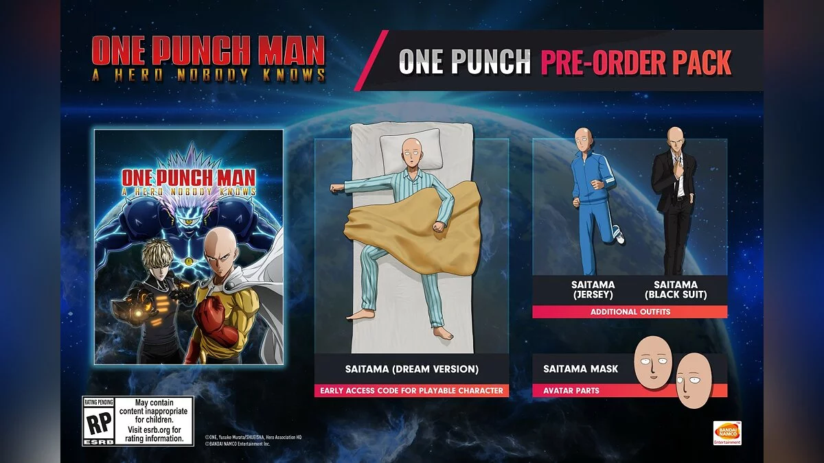 Все предзаказавшие игру до этой даты получат ранний доступ к главному герою Сайтаме в пижаме, который будет сражаться наравне с другими супергероями, а также два скина — спортивный и официальный костюм. Дополнительно игрокам с предзаказом выдадут маски Ванпанчмена для других персонажей.