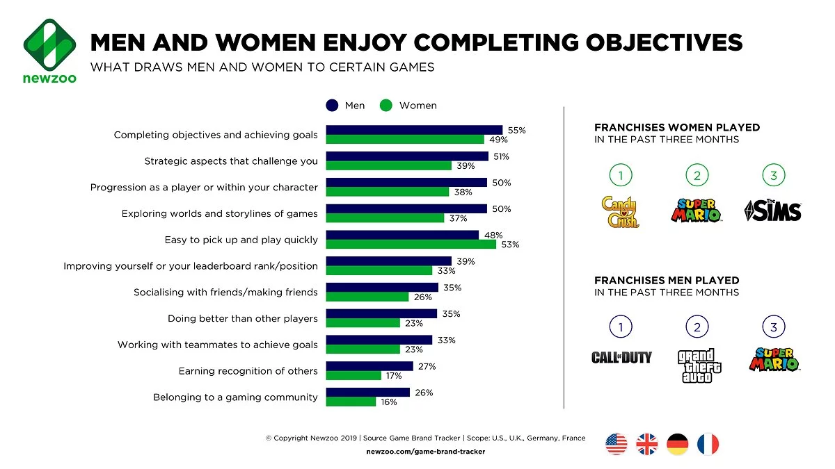 Среди геймплейных предпочтений мужчины чаще выбирали игры с заданиями и достижениями, стратегическими аспектами, прогрессом персонажа и изучением миров. Женщины заинтересовались проектами, в которые можно было быстро начать играть. Три самых популярных франшизы среди женщин стали Candy Crush, Super Mario The Sims. Среди мужчин — Call of Duty, Grand Theft Auto и Super Mario.