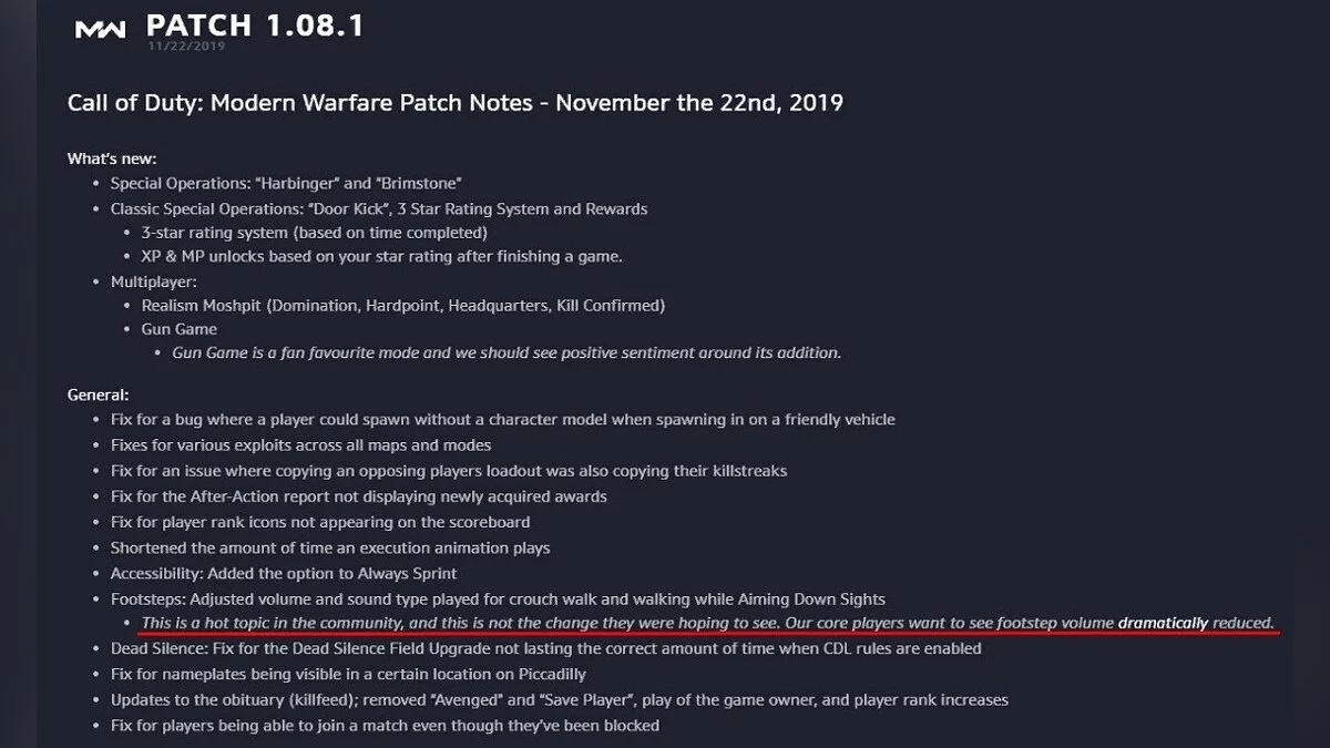 Огромный патч для Modern Warfare вышел на ПК, PS4 и Xbox One. Список изменений растянулся на два листа, а кто-то из разработчиков забыл удалить из него комментарий про важную тему для коммьюнити игры — звук шагов противника в мультиплеере.
