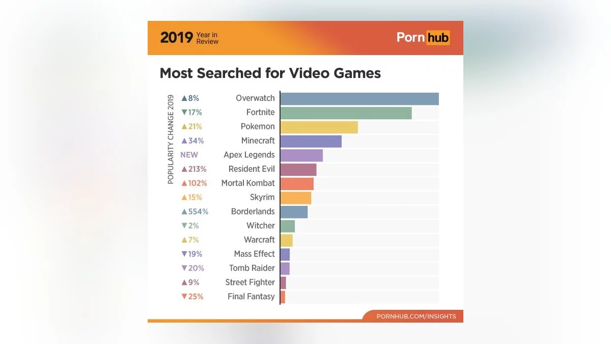 Самые популярные игры на Pornhub — Overwatch, Fortnite и Pokemon. Сильнее всех выстрелила Borderlands — «клубничку» с героями известной серии стали искать в 5 раз чаще.