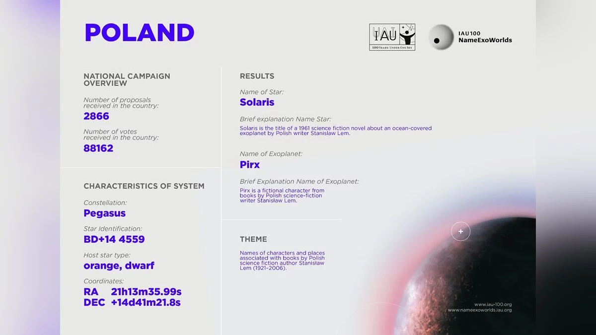 Тем не менее, экзопланета и звезда будут называться совсем иначе — Пиркс и Солярис. Оба имени являются отсылками на творчество польского писателя Станислава Лема.
