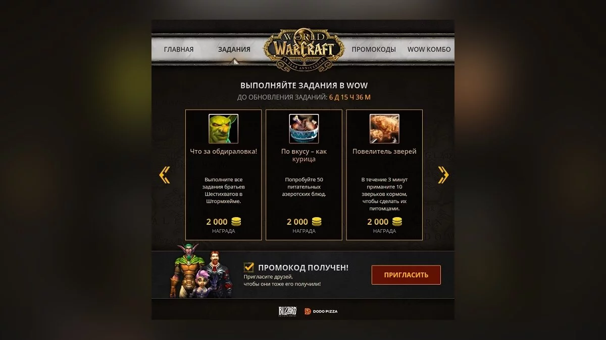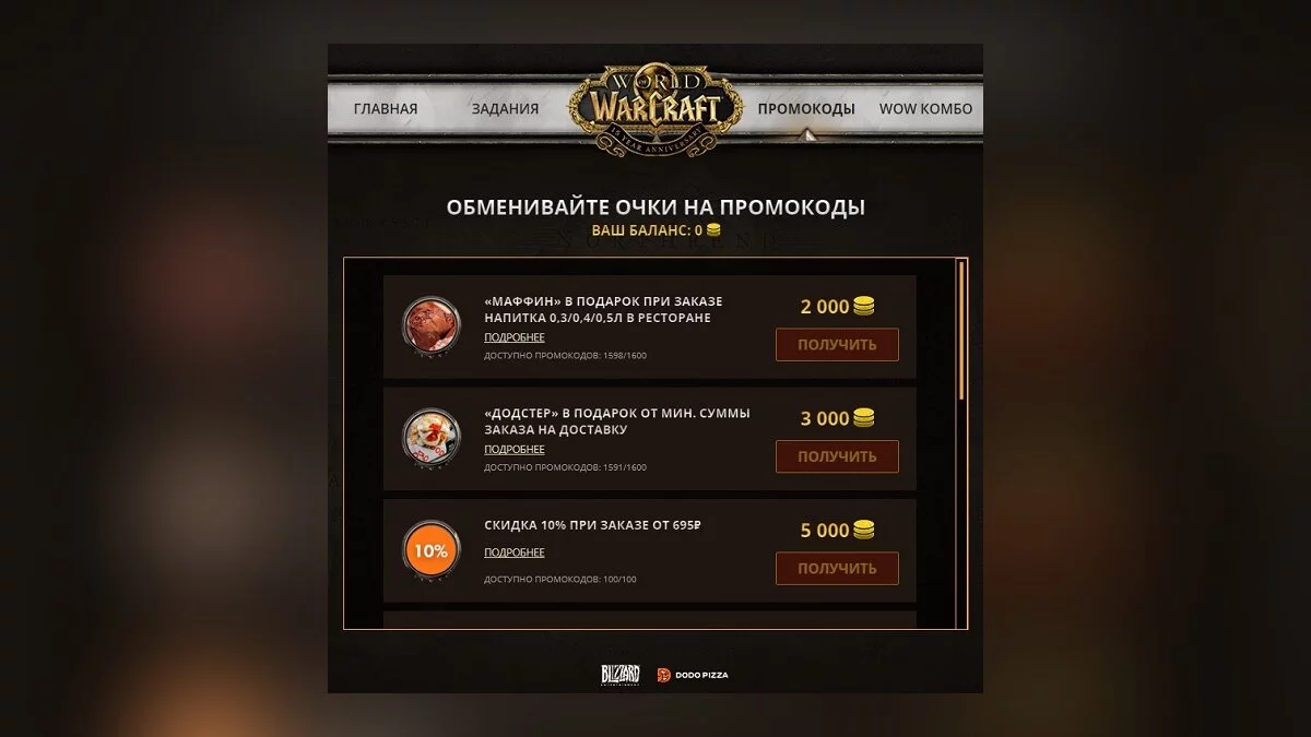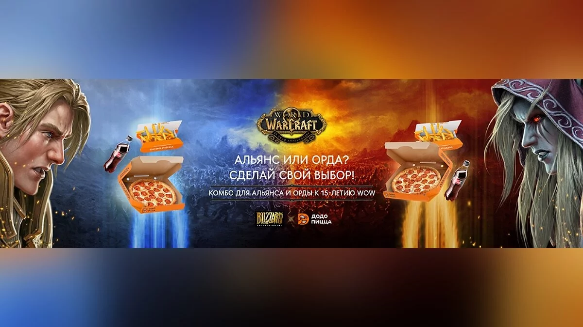 Blizzard Entertainment и «Додо Пицца» объявили о запуске особой акции в честь 15-летия World of Warcraft. В ее рамках пользователи могут приобрести уникальное юбилейное меню, а также обменивать достижения в игре на скидки и подарки от пиццерии.