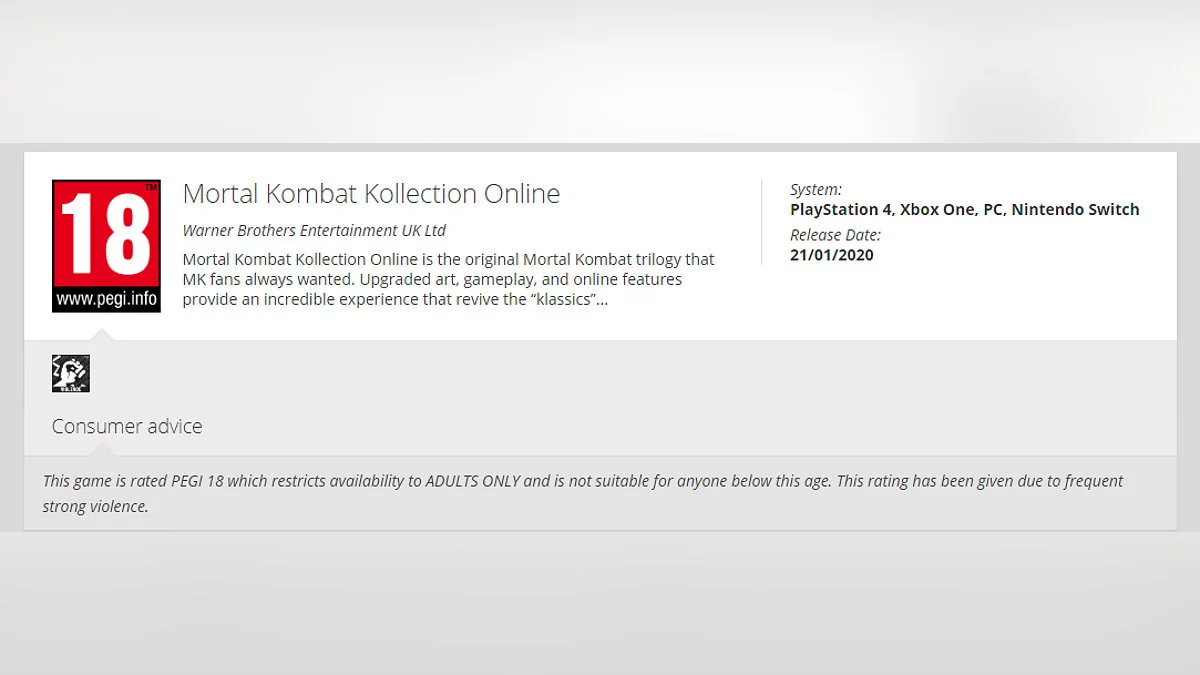 Кроме того, PEGI присвоило Mortal Kombat Kollection Online возрастной рейтинг «18+». Примечательно, что в описании указано, что релиз состоялся 21 января на PC, PS4, Xbox One и Nintendo Switch, хотя, как известно, эта игра все еще не вышла.