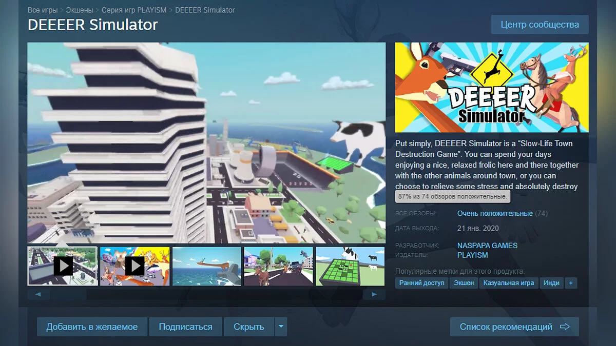 К слову, игрокам такое безумие пришлось по вкусу. На момент написания новости у DEEEER Simulator 87% положительных отзывов. Некоторые геймеры сравнивают игру с Goat Simulator.