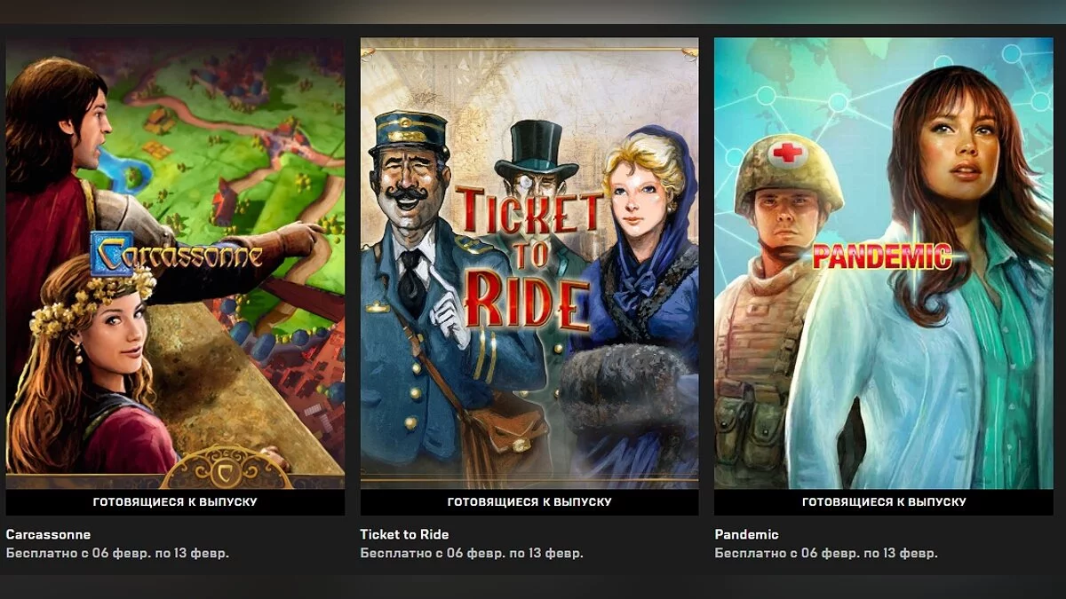 6 февраля магазин подарит сразу три настольные игры — Carcassonne, Ticket to Ride и Pandemic от студии Asmodee Digital.