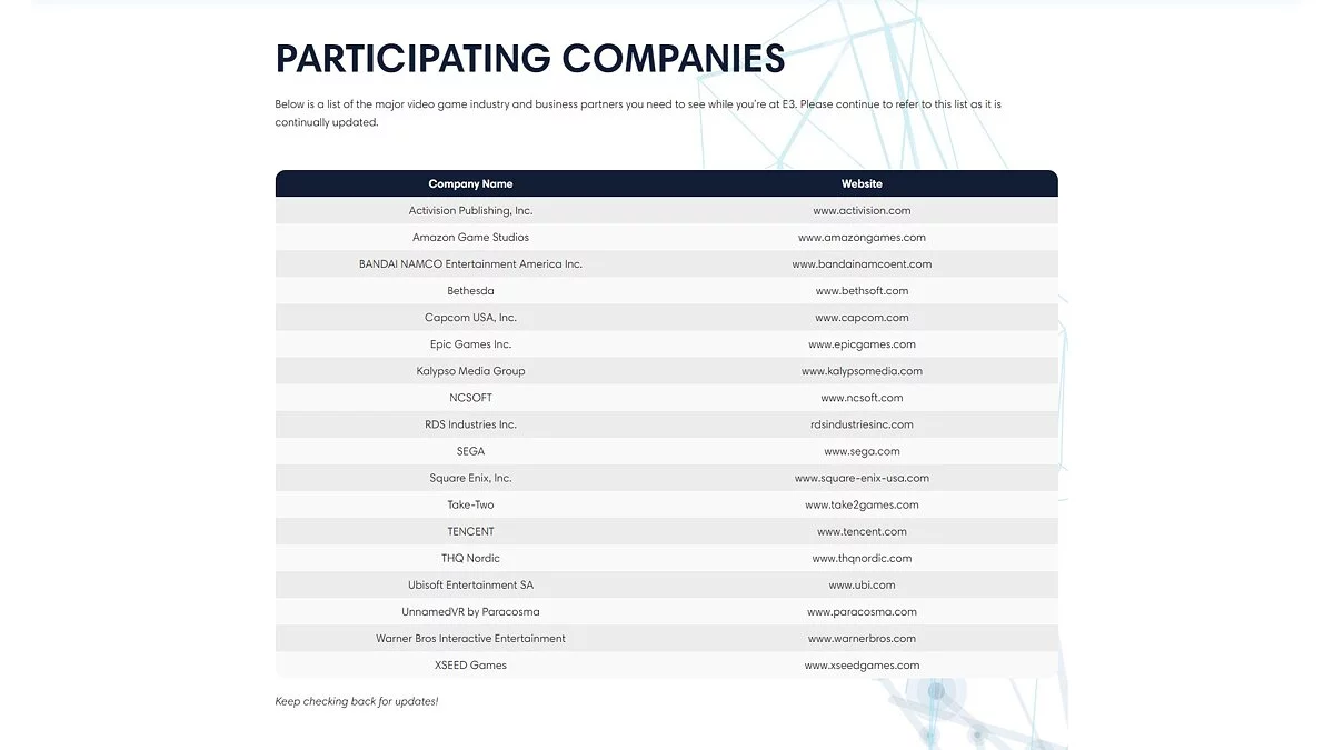 Например, на сайте можно было ознакомиться со списком компаний-участниц: этим летом в Лос-Анджелес приедут Ubisoft, Epic Games, Warner Bros. и не только. Это далеко не полный список: в нем нет Nintendo и Microsoft, хотя последняя свое участие уже подтвердила.