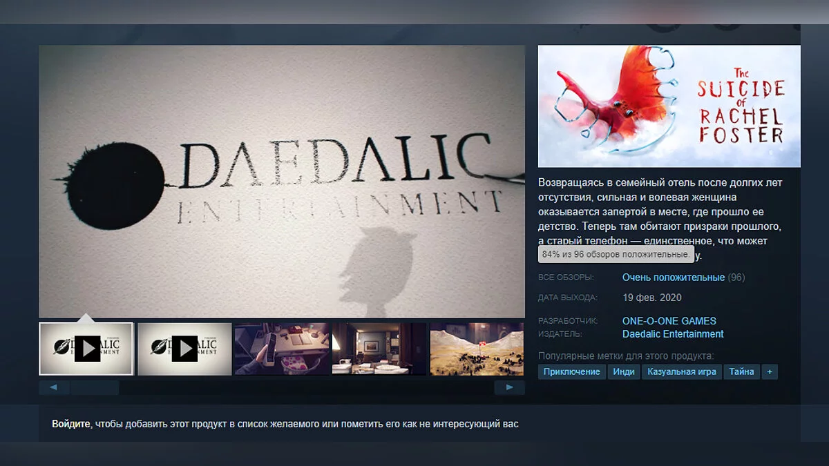 До 26 февраля The Suicide of Rachel Foster продается со скидкой 25% в Steam (337 руб) и GOG (339 руб). С текстовой версией прохождения этой игры можете ознакомиться здесь.