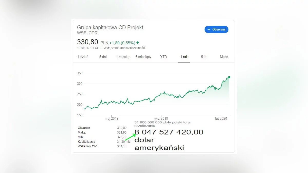 Хотя CDP оценивалась в 6,8 млрд $ всего лишь месяц назад, теперь компания обладает 8 млрд $ после выпуска своего хита «Ведьмак 3: Дикая охота» на Nintendo Switch. Популярность игры выросла на 500 процентов за два месяца, все благодаря выходу одноименного сериала на Netflix. Несмотря на перенос, горячо ожидаемая Cyberpunk 2077 тоже повлияла рост.