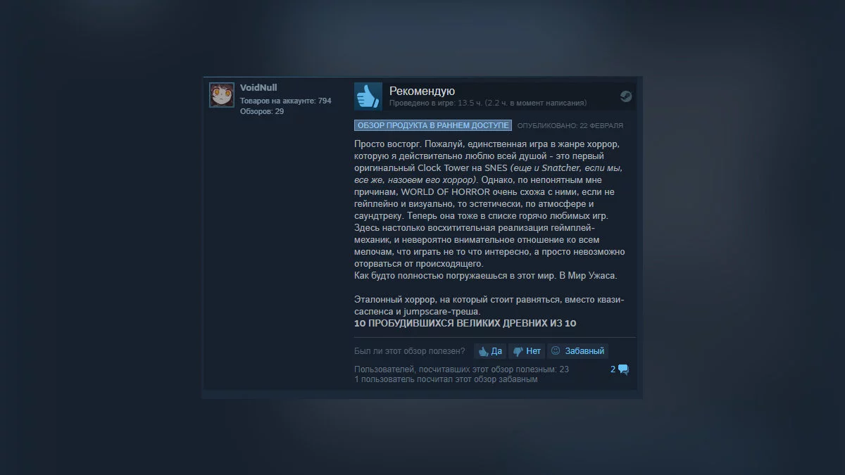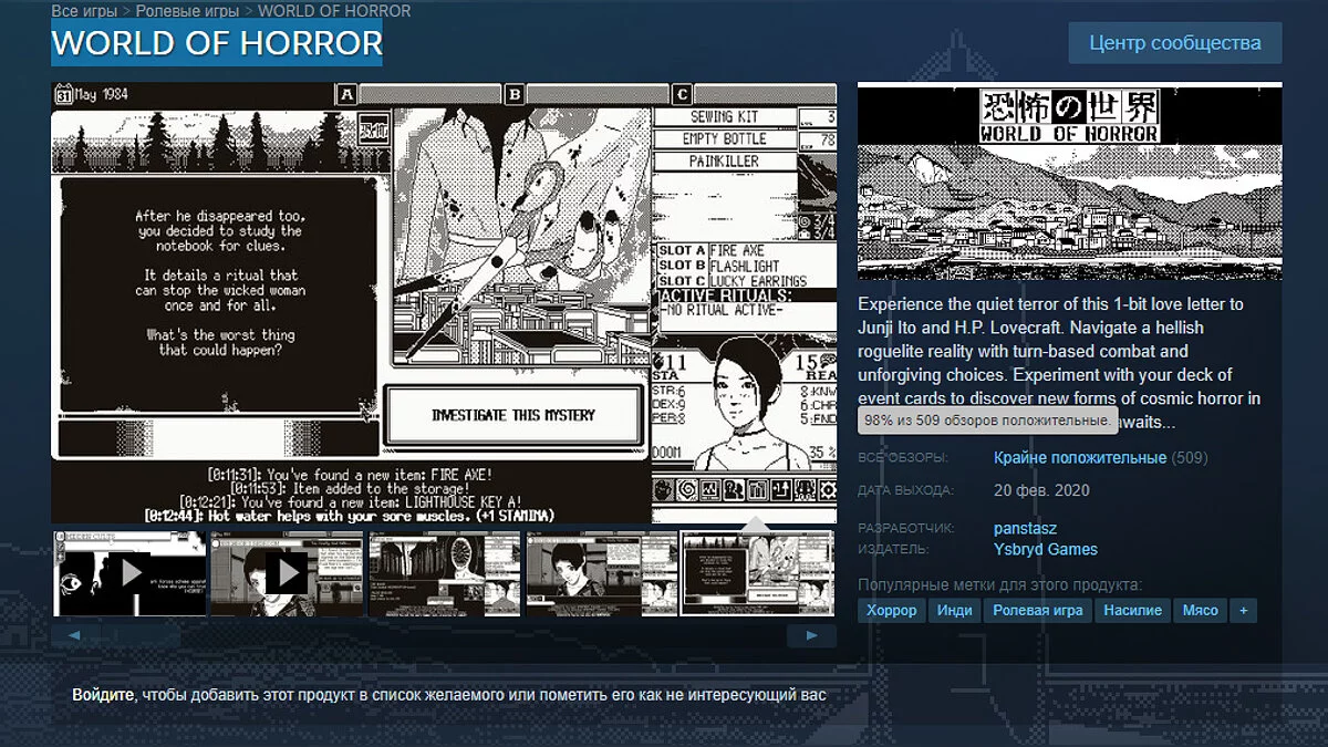 Не так давно в раннем доступе Steam вышел крайне необычный хоррор под названием World of Horror, который был создан стоматологом Павлом Козьминским (Pawel Kozminski). В первые дни игра получила 98% положительных отзывов от геймеров (на момент написания).