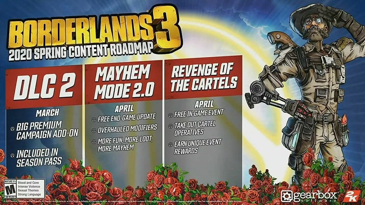 Разработчики представили планы на бесплатные обновления на весну. В апреле в Borderlands 3 появится режим Mayhem Mode 2.0 и сезонное событие Revenge of the Cartels. Mayhem Mode 2.0 улучшит энд-гейм игры и работу модификаторов. Revenge of the Cartels предложит задания по уничтожению оперативников картеля за уникальные награды.