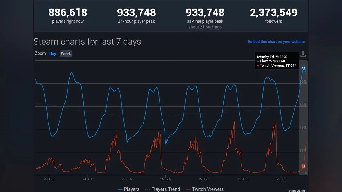 Предыдущий рекорд в 874 тыс. одновременных игроков в онлайне был установлен 8 февраля 2020 года.