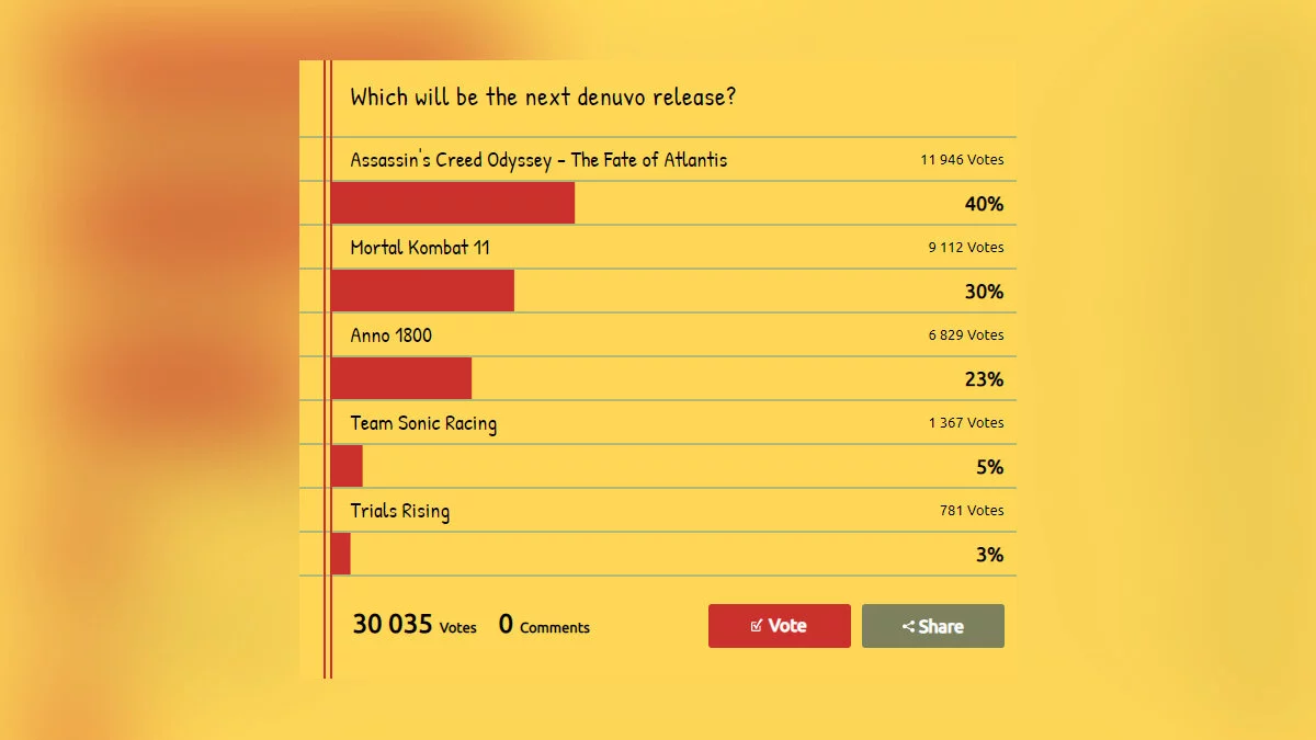 В феврале мы сообщали об одном хакере с ником 0xC000005, который сделал очень громкое заявление, пообещав взломать все игры с Denuvo. Недавно он запустил опрос, в котором спрашивает у геймеров, что ему взломать на этот раз.