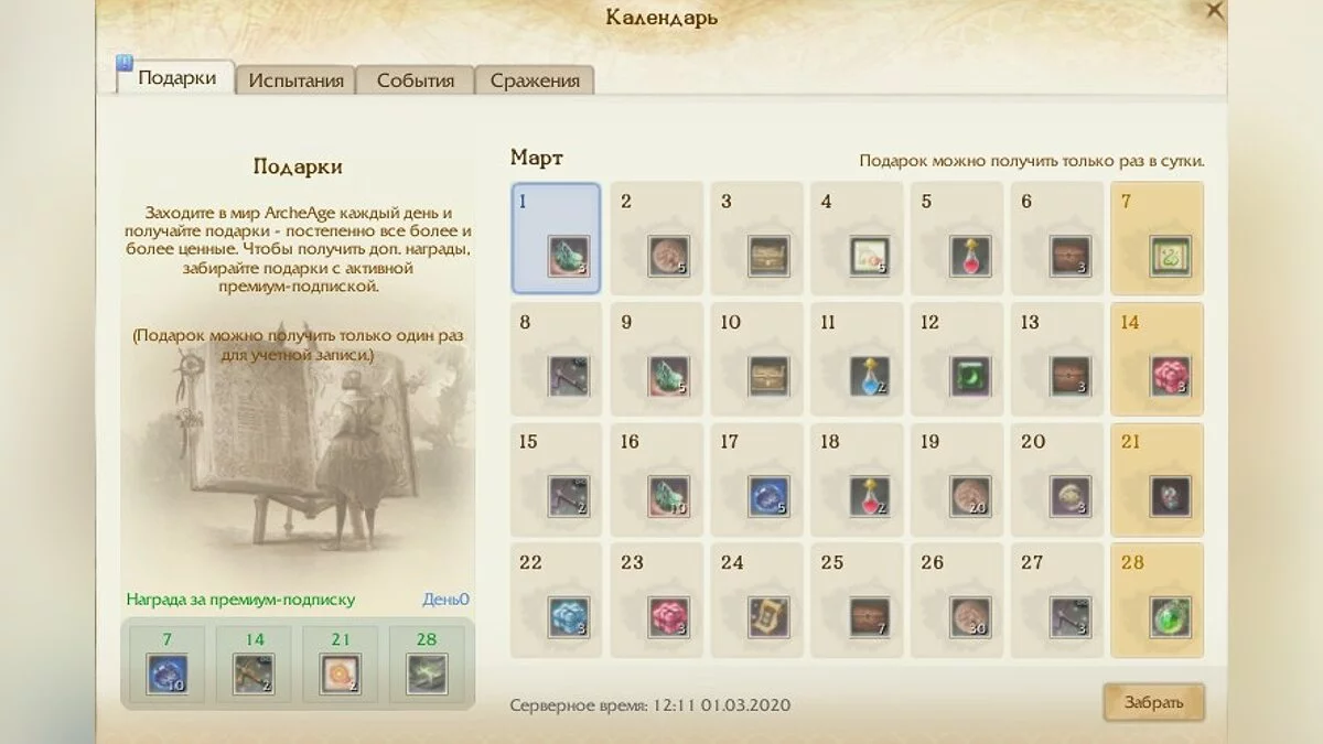 А вот, какие бонусы ждут геймеров в марте за ежедневные входы в игру: