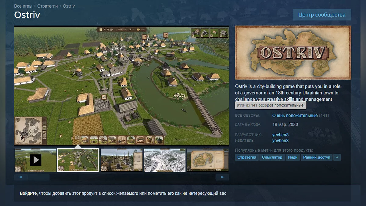 Украинский разработчик yevhen8 на днях выпустил в раннем доступе Steam новый градостроительный симулятор — Ostriv. По его словам, он позволяет геймерам создать вымышленный украинский город 18-го века, продемонстрировав свои творческие способности и мастерство руководить.