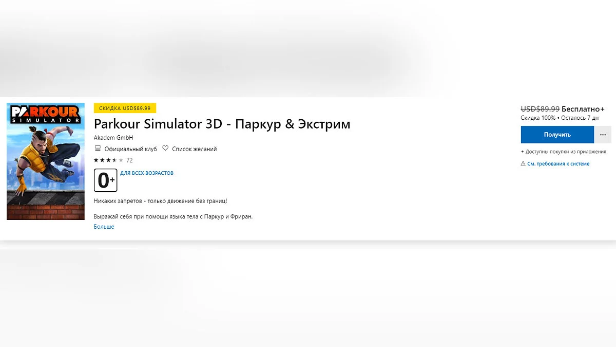 В Parkour Simulator 3D предлагают стать настоящим трейсером и выполнять различные акробатические трюки. Игру можно забрать бесплатно в течение семи дней.