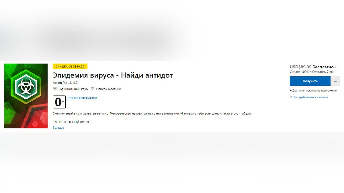 «Эпидемия вируса — Найди антидот» — стратегия, в которой геймерам нужно будет спасти человечество от вируса (название можно придумать самому). Игру можно забрать бесплатно в течение семи дней.