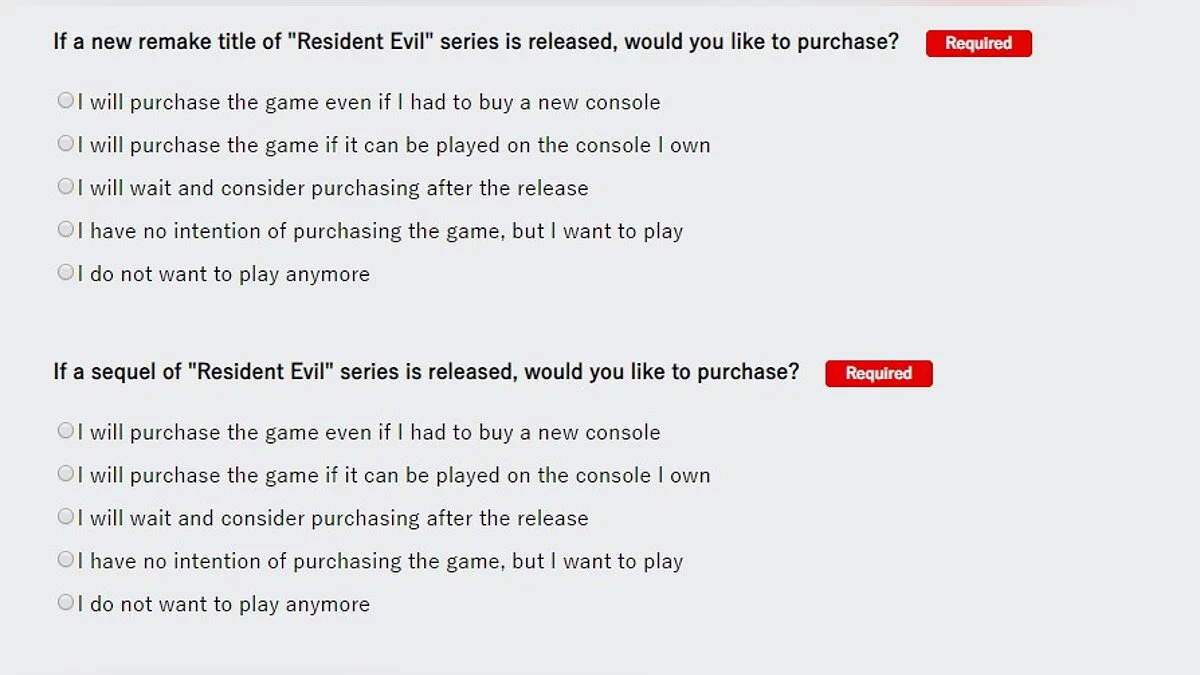 В опросе на официальном сайте компания по большей части интересуется обратной связью по свежей игре, но также спрашивает о будущем серии Resident Evil. В частности, Capcom хотела бы знать, купите ли вы ремейк или сиквел при условии, что он появится только на консолях следующего поколения — PlayStation 5 и Xbox Series X.