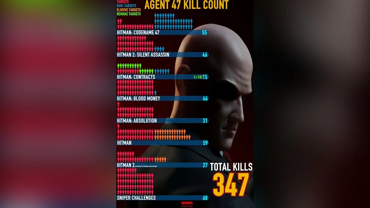 Общий показатель составил 348 убийств (позже игрок уточнил, что сначала забыл про одного противника, а поэтому на картинке указано число 347). Красным цветом выделены цели Агента 47, а синим — обычные противники, которых нужно было убить, чтобы пройти миссии. Больше всего убийств NPC приходится на оригинальную Codename 47, в которой врагов нельзя было оглушать. Из-за этого игроку и пришлось убивать всех, кто преграждал путь к прохождению игры.