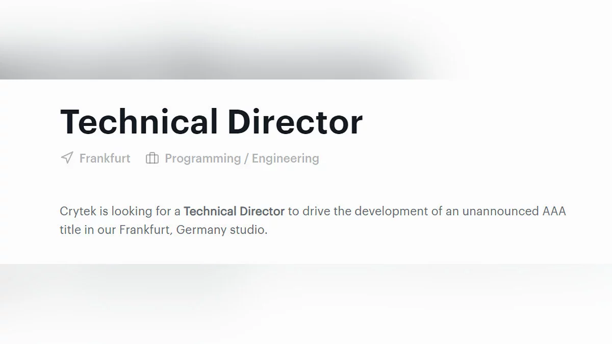 На сайте Crytek появилась вакансия на должность нового технического директора, который, внимание, будет заниматься неанонсированной AAA-игрой, разрабатываемой студией во Франкфурте (Германия).