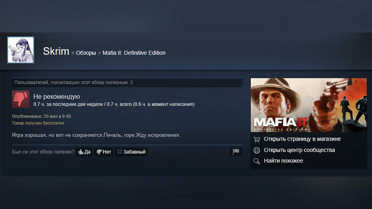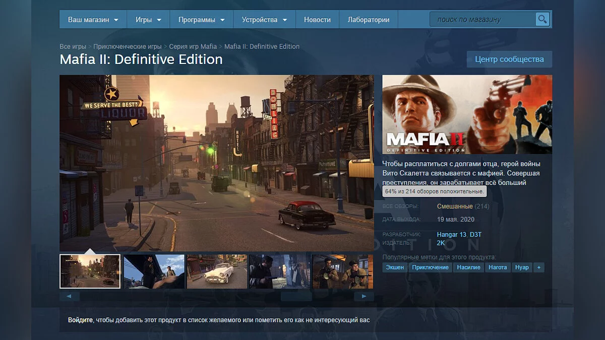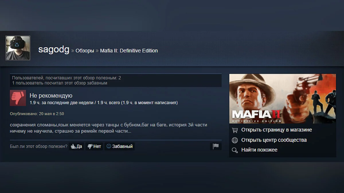 На момент написания новости рейтинг игры составляет 64%. К слову, оригинальная Mafia 2 имеет 94% положительных отзывов.