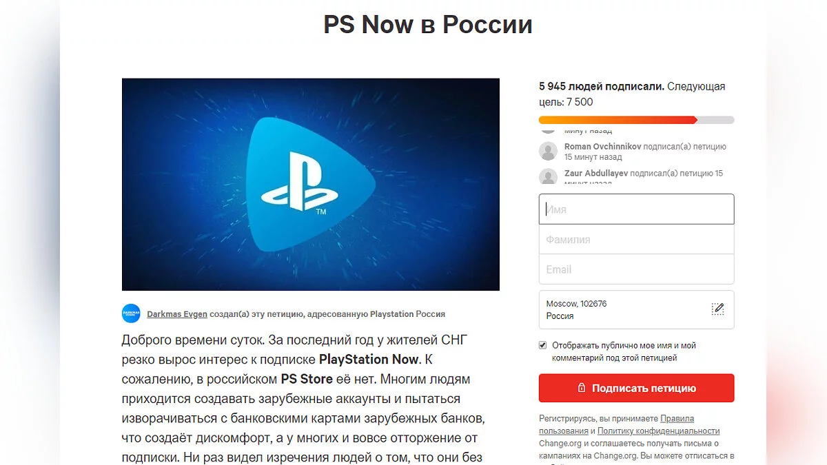 На сайте Change.org появилась петиция, в которой люди просят Sony запустить PlayStation Now в России. Этот сервис (по подписке) позволяет играть в игры с PlayStation на ПК и мобильных устройствах.