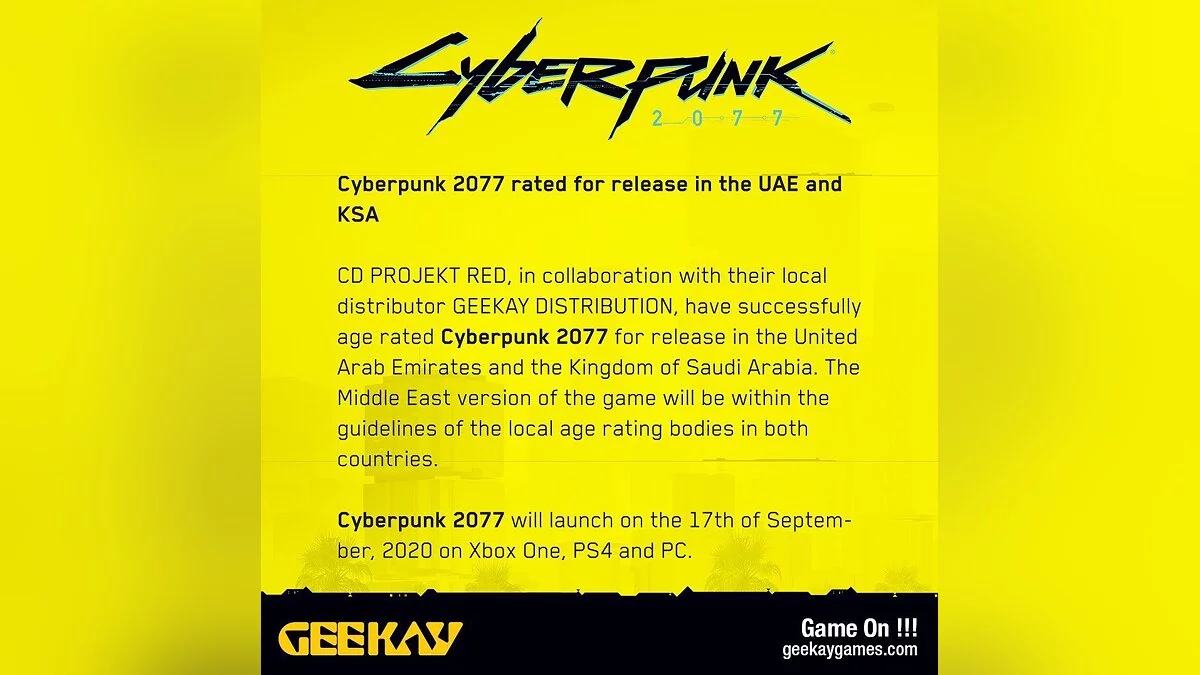 CD Projekt RED совместно с дистрибьютором Geekay сообщила (признано в России экстремистской организацией) о успешном получении рейтинговой оценки для выпуска Cyberpunk 2077 в странах Ближнего Востока. Интересно, что при этом The Last of Us Part 2 не смогла получить рейтинг для релиза в этом регионе.