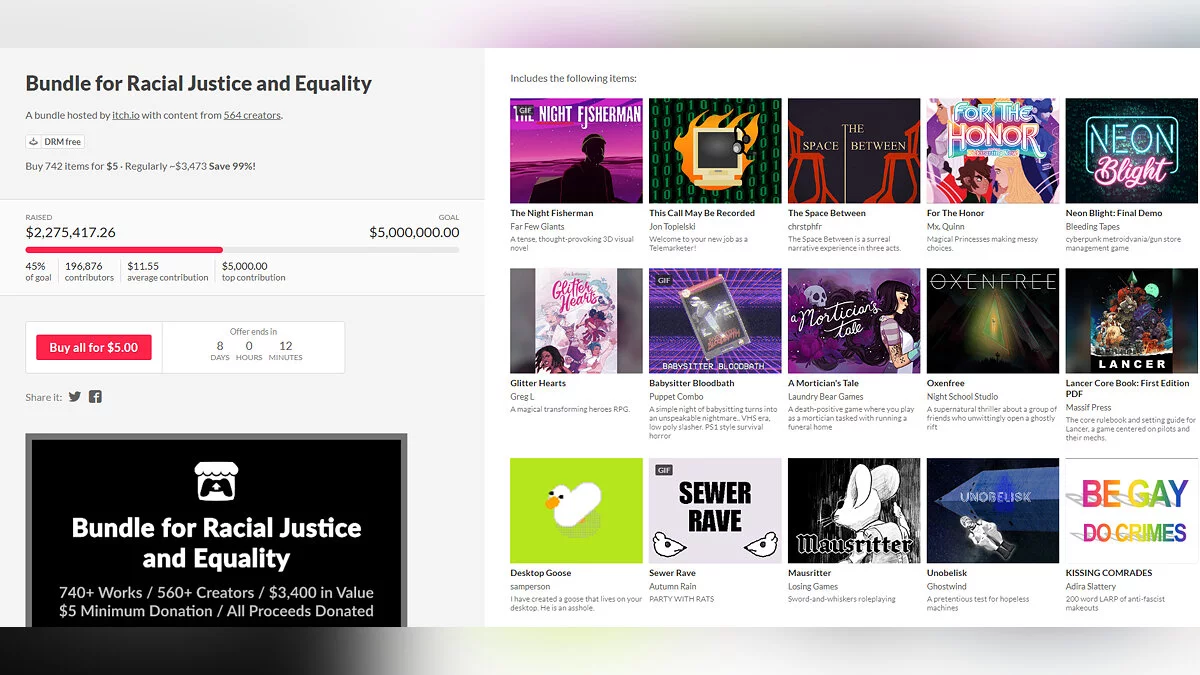 Ресурс Itch.io в рамках акции в поддержку движения Black Lives Matter («Жизни чернокожих важны») распродает бандл, включающий в себя 742 игры от 564 разработчиков, с сумасшедшей скидкой 99%.