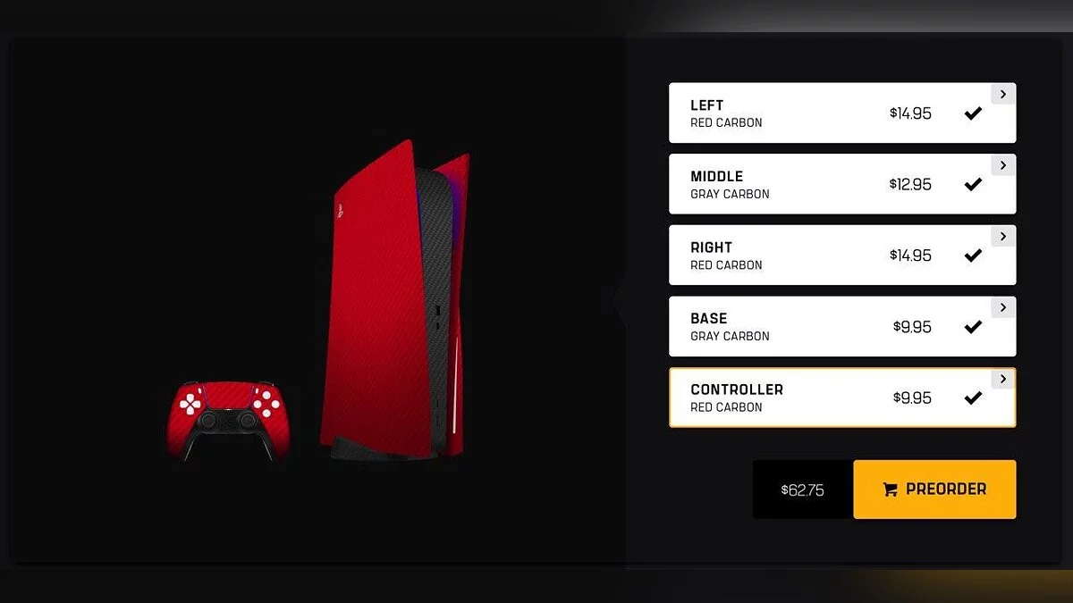 Покупатель может выбрать наклейки для левой и правой стороны корпуса, основания приставки, подставки и контроллера DualSense. Итоговая стоимость со всеми наворотами составляет $62,75 (около 4400 рублей).