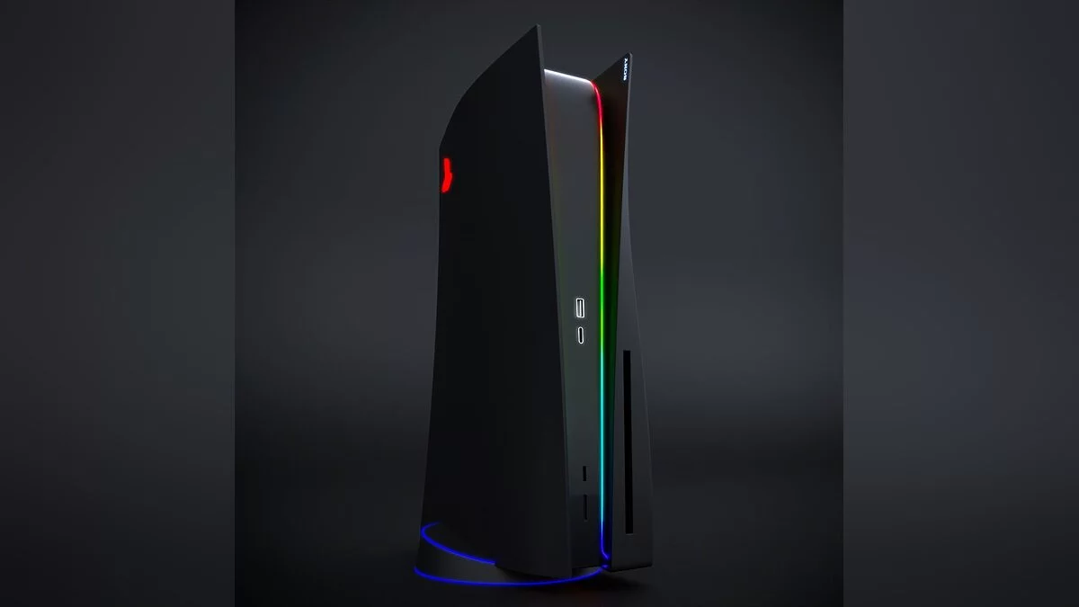 Угольно-черный пластик, разноцветная RBG-подсветка по всему корпусу — при прочих равных эту «версию» PlayStation 5 можно было бы принять за стилизованный под продукцию Sony игровой системный блок. Но — нет, речь все же идет об авторской стилизации.