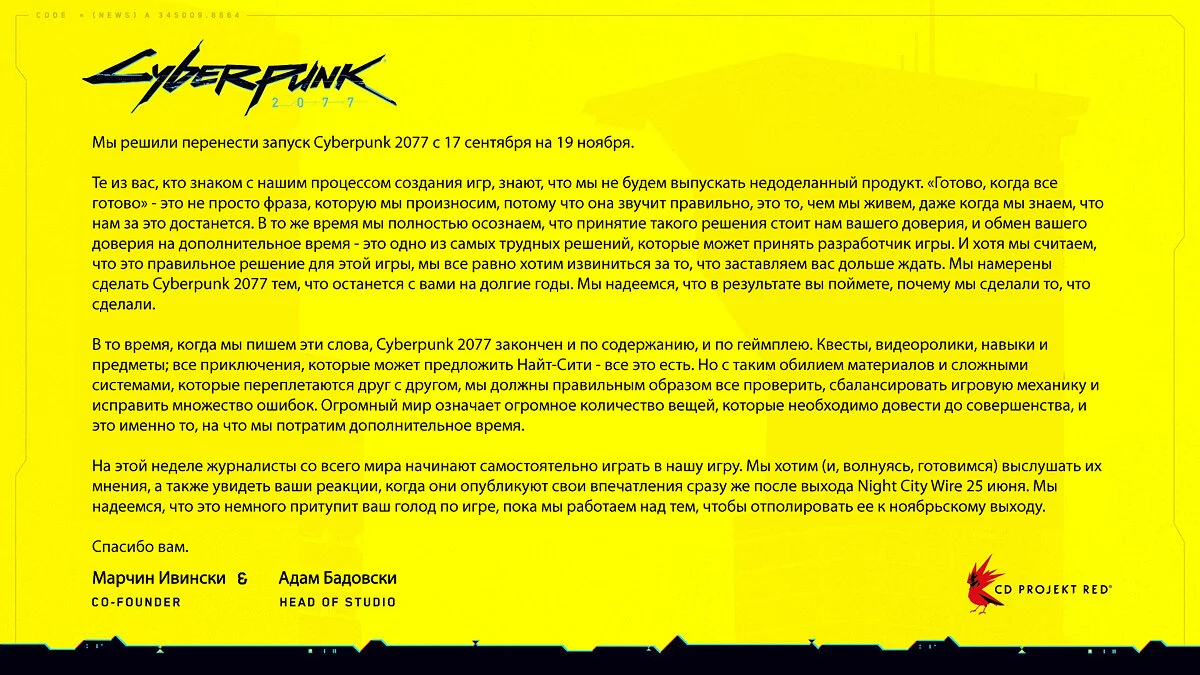 Те из вас, кто знаком c нашим процессом создания игр, знают, что мы не будем выпускать недоделанный продукт. «Готово, когда все готово» — это не просто фраза, которую мы произносим, потому что она звучит правильно, это то, чем мы живем, даже когда мы знаем, что нам за это достанется. В то же время мы полностью осознаем, что принятие такого решения стоит нам вашего доверия, и обмен вашего доверия на дополнительное время — это одно из самых трудных решений, которые может принять разработчик игры. И хотя мы считаем, что это правильное решение для этой игры, мы все равно хотим извиниться за то, что заставляем вас дольше ждать. Мы намерены сделать Cyberpunk 2077 тем, что останется с вами на долгие годы. Мы надеемся, что в результате вы поймете, почему мы сделали то, что сделали.