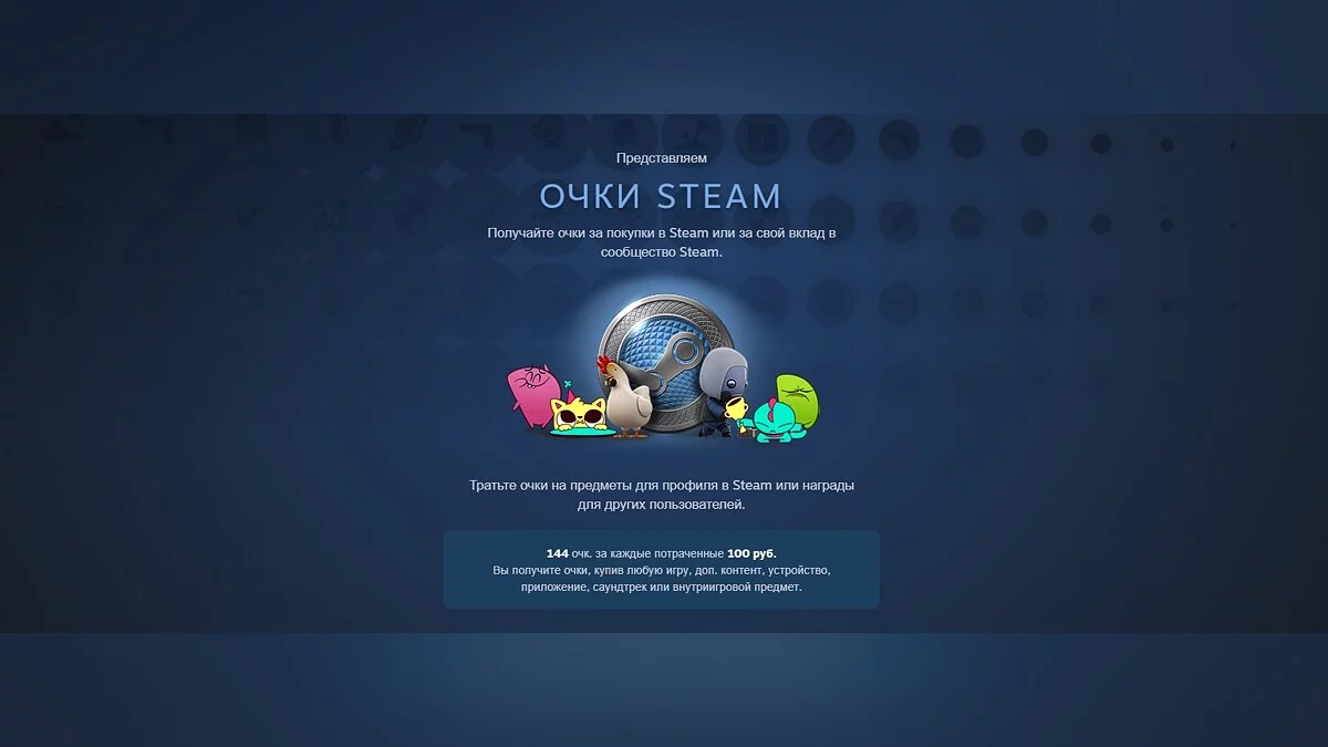 Кроме того, в Steam открылся специальный магазин очков. За покупки игр пользователь получает очки (144 очков за каждые потраченные 100 pублей), которые можно потратить на украшение своего профиля анимированными аватарами, рамками, фонами и прочей косметикой.