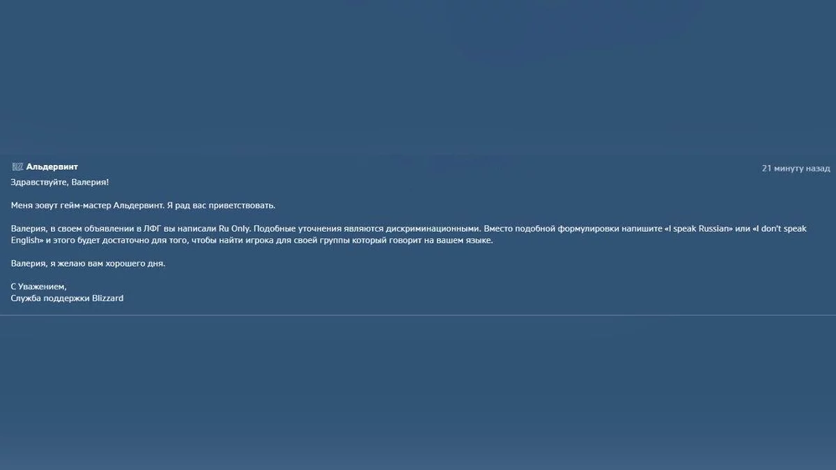 В объявлении поиска группы Валерия написала уточнение «RU Only». Альдервинт посчитал, что формулировка может оскорбить игроков, которые не говорят по-русски, и посоветовал писать вместо этого «I speak Russian» или «I don't speak English»