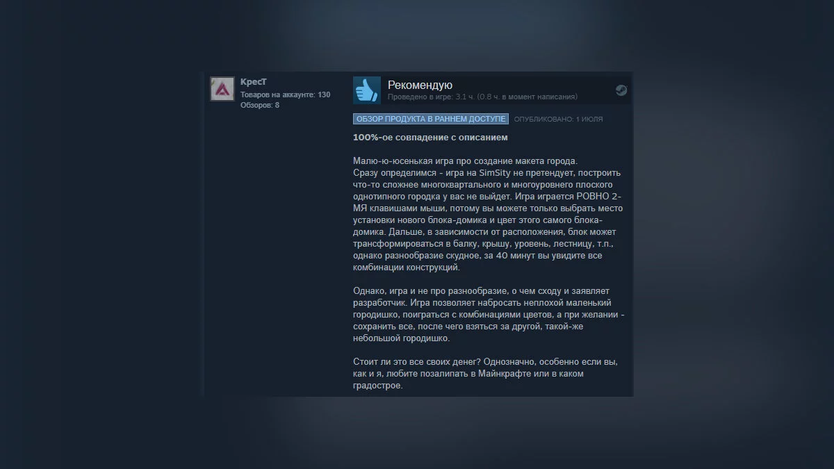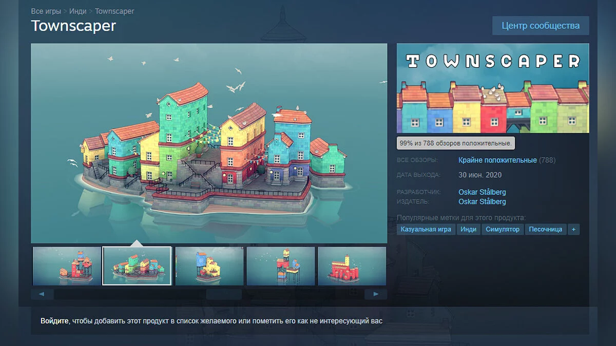 30 июня в раннем доступе Steam вышла игра под названием Townscaper, которую разработчик называет простым конструктором городов. Всего за несколько дней инди-проект без какой-либо предварительной PR-кампании получил 99% положительных отзывов (более 700 пользовательских обзоров).
