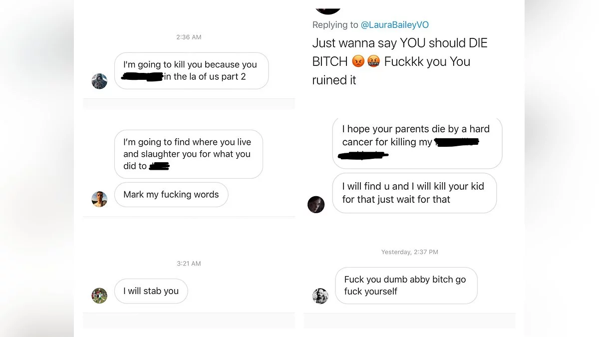 К сообщению приложен скриншот с подборкой всевозможных сообщений от хейтеров игры и самой актрисы. В частности один из пользователей желает смерти родителям Лауры и сообщает, что он, цитата, «Найдет ее и убьет ее ребенка». Другой пользователь обещает убить актрису из-за того, что она якобы сделала в The Last of Us Part II.