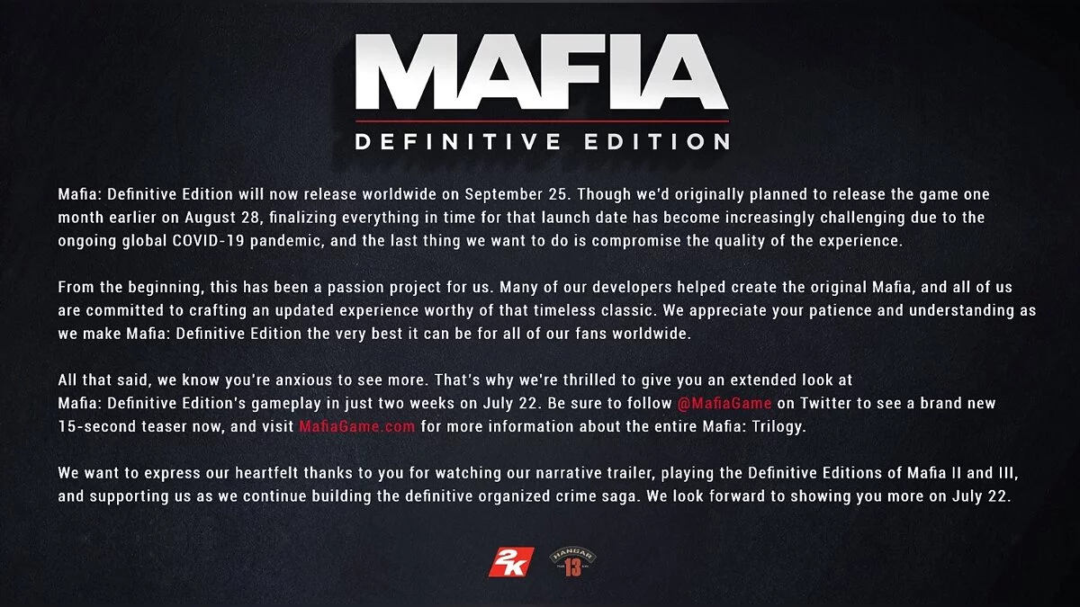 Возможно, что в ближайшее время 2K Games объявит о переносе Mafia: Definitive Edition. Пользователи сети обратили внимание, что на официальном сайте игры изменилась дата выхода.
