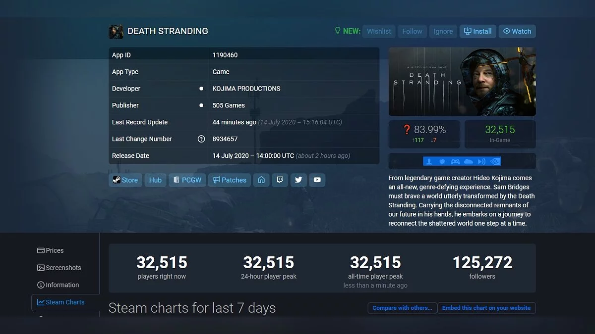 Death Stranding ожидаемо попала в топ трендовых игр сервиса. По данным SteamDB, сейчас восстановлением Америки занимается 32 тысячи человек онлайн.