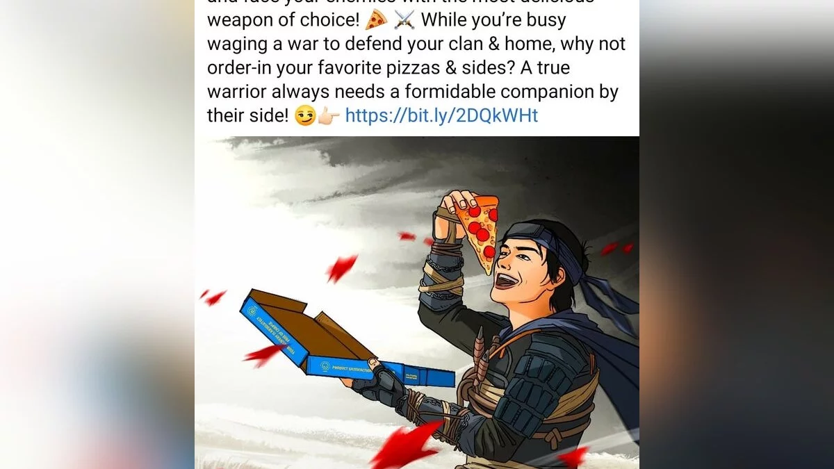 «Всем самураям, включите свой режим невидимой и сражайтесь с врагами вместе с самым вкусным оружием на ваш выбор! Пока вы заняты войной ради защиты своего клана и дома, почему не заказать свою самую любимую пиццу? Настоящий воин всегда нуждается в грозном компаньоне, действующем на его стороне».