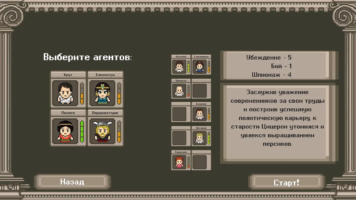Long Live Caesar — пошаговая стратегия/ РПГ / рогалик, где вы берете на себя роль Гая Юлия Цезаря, который должен за неделю вычислить всех заговорщиков в Сенате, Магистрате и Легионе. В империи наступают смутные времена: сенаторы плетут интриги, армия бунтует, а римские граждане ждут от вас волевых решений. Сможете ли вы устоять перед нависшей угрозой и спасти Рим?