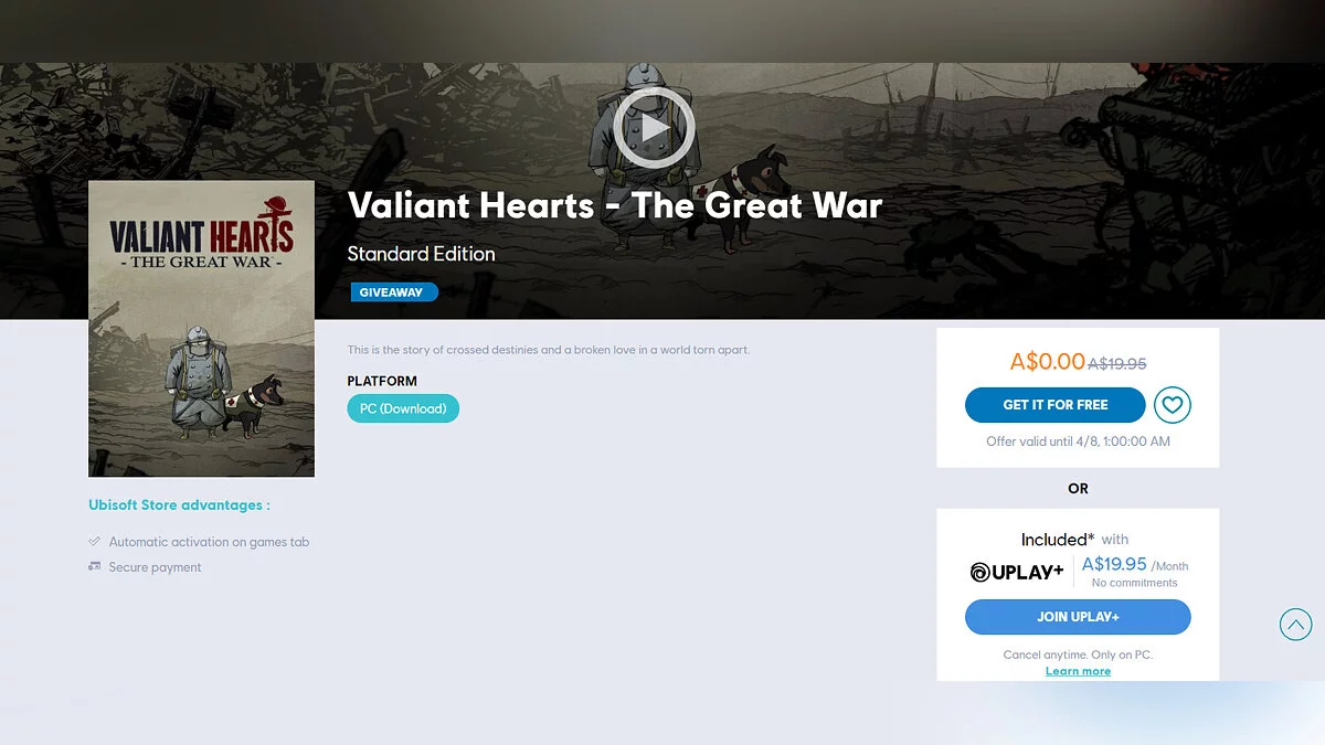 В Ubisoft Store сейчас бесплатно раздают квест-головоломку про Первую мировую войну Valiant Hearts: The Great War, которая вышла в 2014 году. По крайней мере, об этом говорится на страничке игры (в австралийском регионе). Однако многие геймеры пишут, что столкнулись с проблемой, пытаясь добавить игру в свою библиотеку.