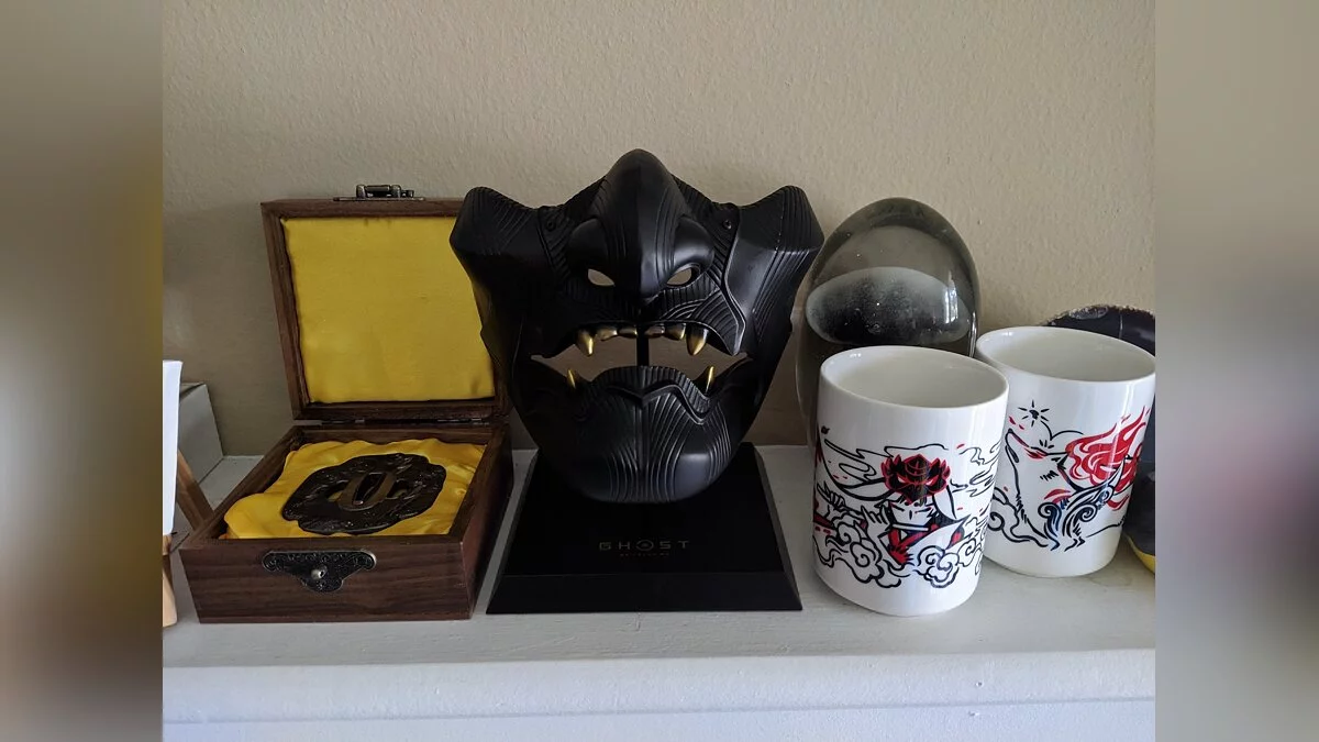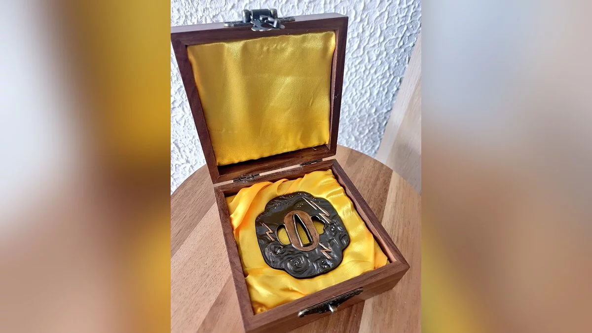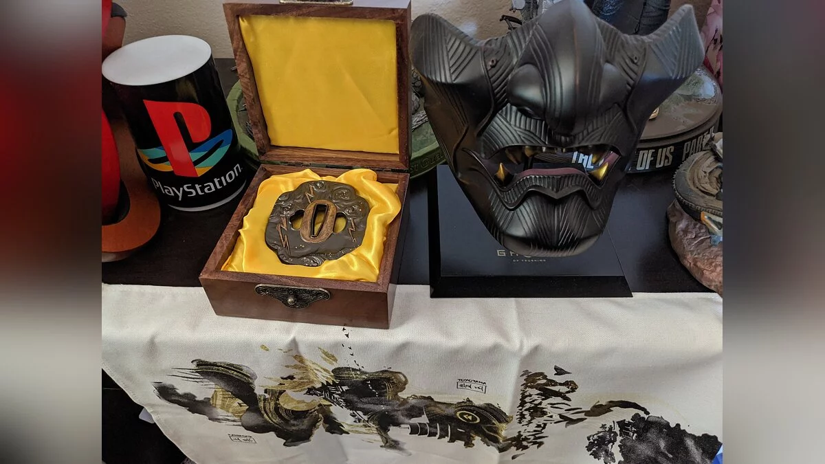 Sony recently ran an internal competition: The first 50 players to unlock the platinum trophy for Ghost of Tsushima won a replica tsuba (sword hand-guard) in a beautifully engraved display box.