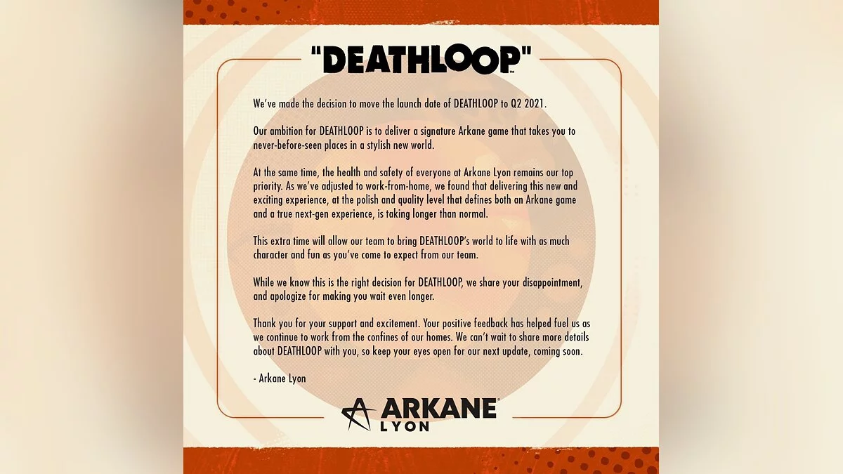 Здоровье и безопасность сотрудников в Arkane Lyon явялется для нас высшим приоритетом. По мере того, как мы адаптировались к работе из дома, мы обнаружили, что полировка и контроль качества игры, которая подарит вам новый и захватывающий опыт, занимает больше времени, чем обычно.