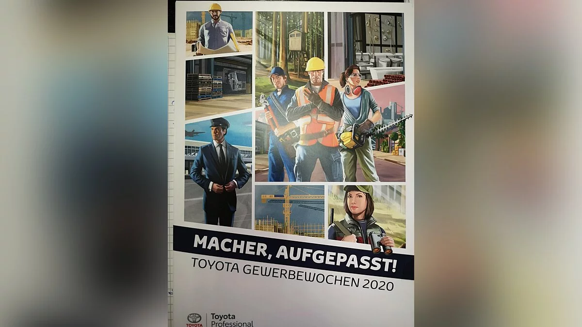 Крупнейшая японская корпорация Toyota, похоже, не прочь подсмотреть у Rockstar Games. На брошюре изображены представители разных профессий, от строителей до пилота самолета. Выполнен рисунок в стиле официальной обложки GTA.