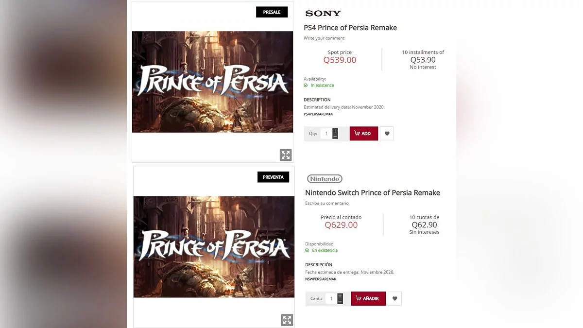 На сайте гватемальского ритейлера MAX появились страницы ремейка Prince of Persia для PlayStation 4 и Nintendo Switch. Описание гласит, что премьера намечена на ноябрь этого года.