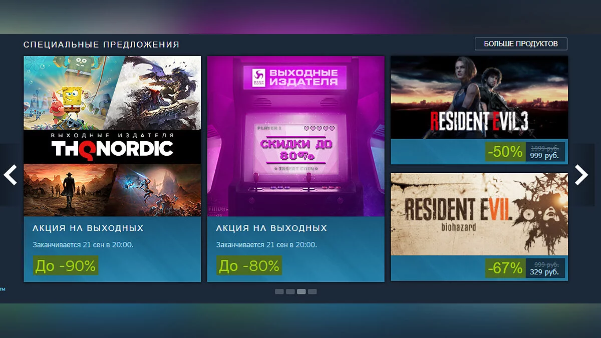 В Steam стартовали новые распродажи игр. В частности, по сниженной цене предлагают продукцию от THQ Nordic, Deep Silver и Asmodee Digital. Кроме того, сейчас также доступны скидки на игры про пиратов и серию Resident Evil. Таким образом, в Steam доступны сразу пять распродаж.