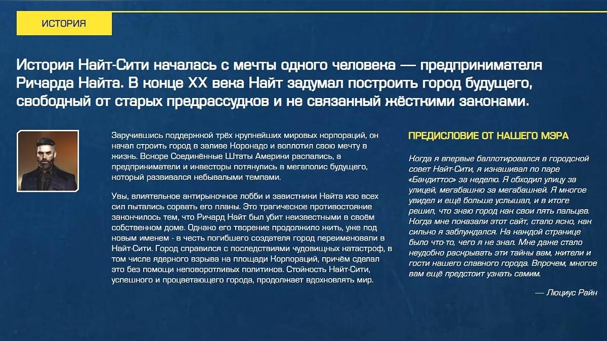 Помимо этого, на сайте рассказывается история Найт-Сити, которая началась с мечты предпринимателя Ричарда Найта. Он хотел построить город, лишённый предрассудков и старых законов. И хотя Найта убили неизвестные, мегаполис всё же был построен.